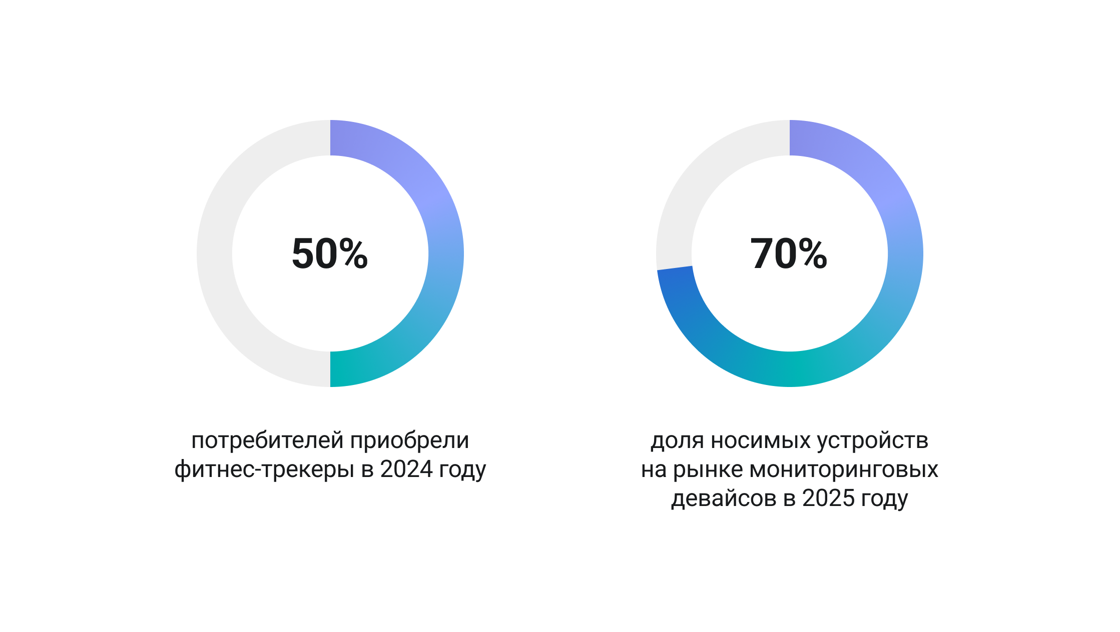 - Распространение носимых устройств: 50% потребителей приобрели фитнес-трекеры в 2024 году, и теперь они преобладают на рынке мониторинговых девайсов с долей свыше 70% — Business Insider, PatentPC