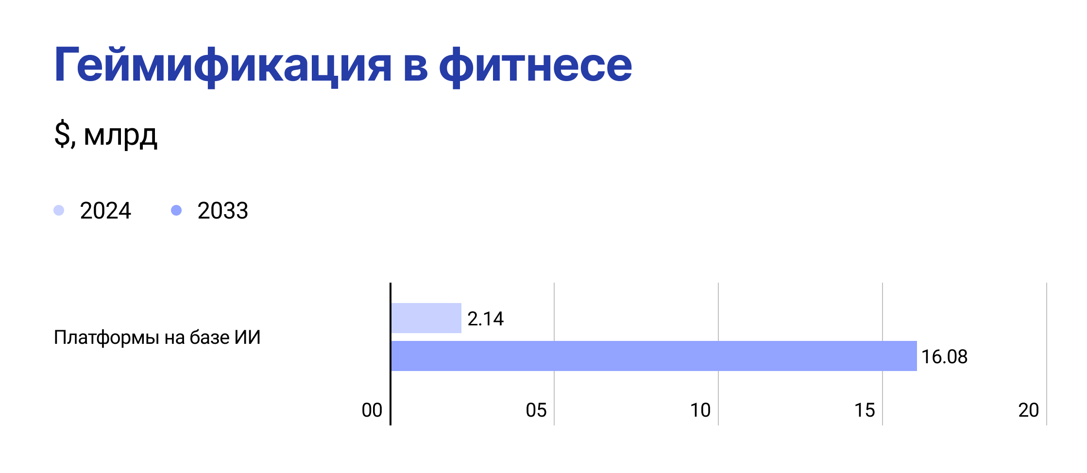 - Геймификация в фитнесе: платформы на базе ИИ $2,14 млрд в 2024 → $16,08 млрд к 2033 (среднегодовой темп роста ~24,1%) — DataIntelo