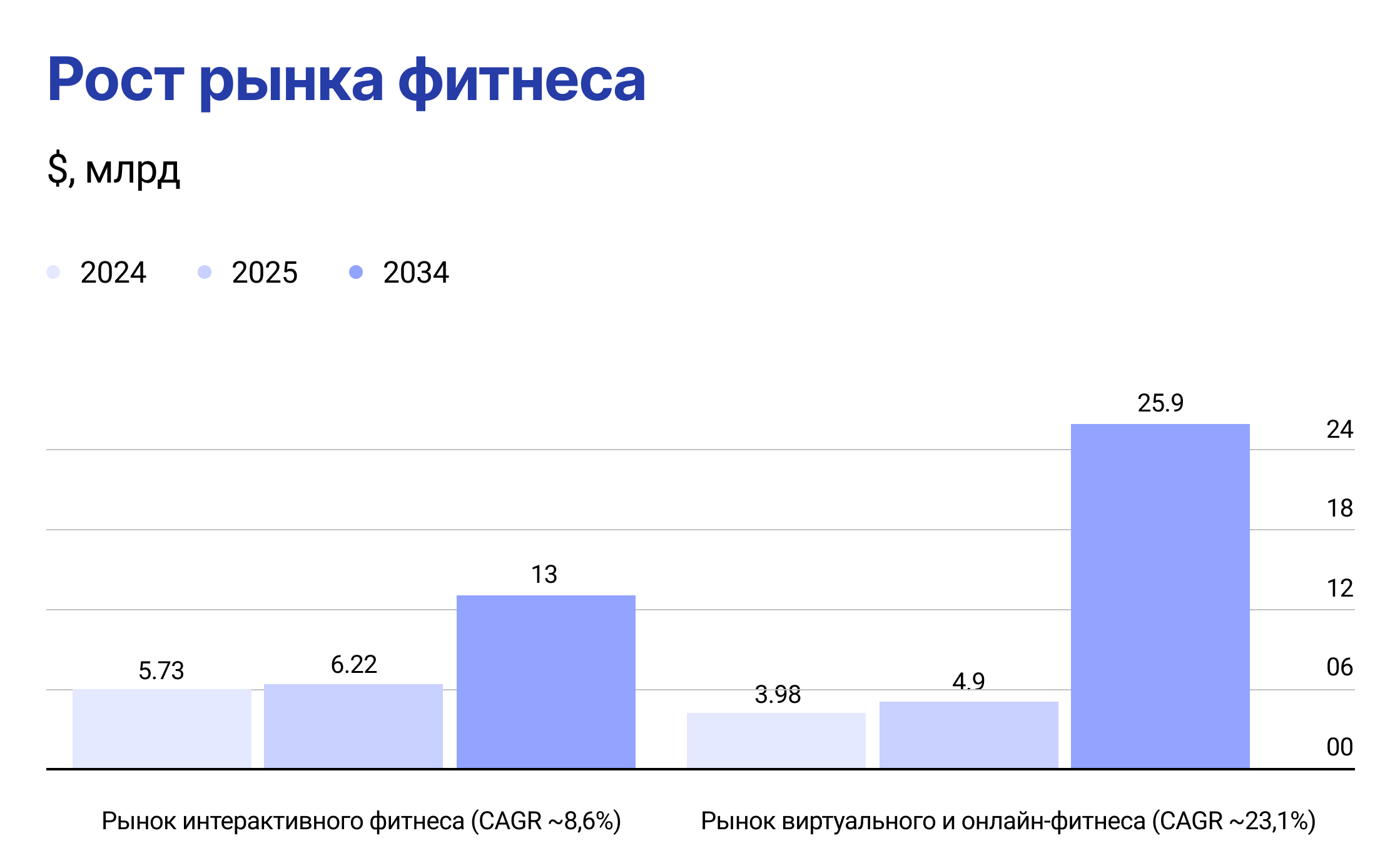 - Рынок интерактивного фитнеса: $5,73 млрд в 2024 → $6,22 млрд в 2025 → $13 млрд к 2034 (среднегодовой темп роста ~8,6%) — Global Growth Insights